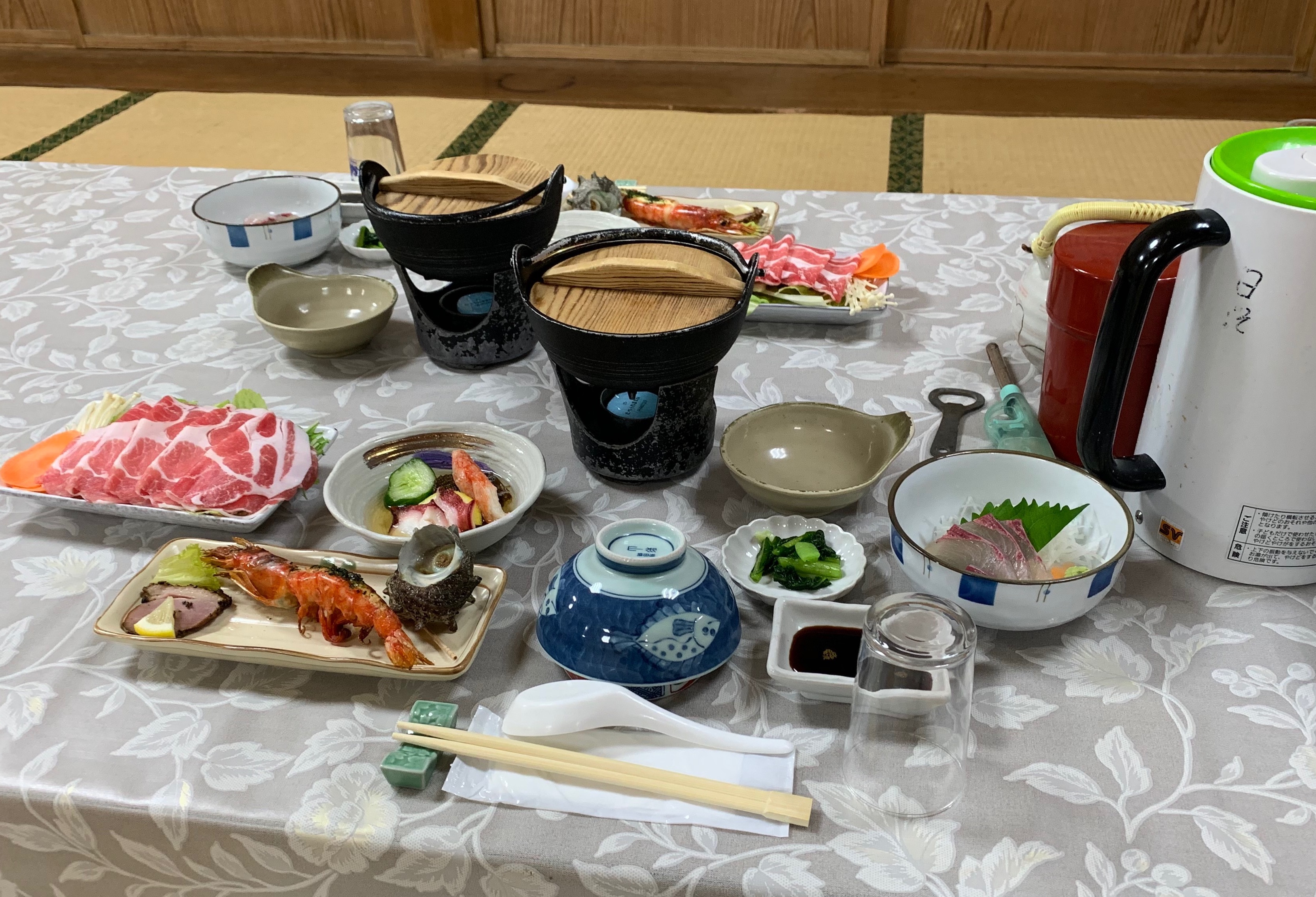 食事も出してもらえたが、夕食会場も広い。メニューも豚しゃぶ、刺身、エビと豪華で美味しく、ご飯のお代わりも、もう食えないくらい出てくる。