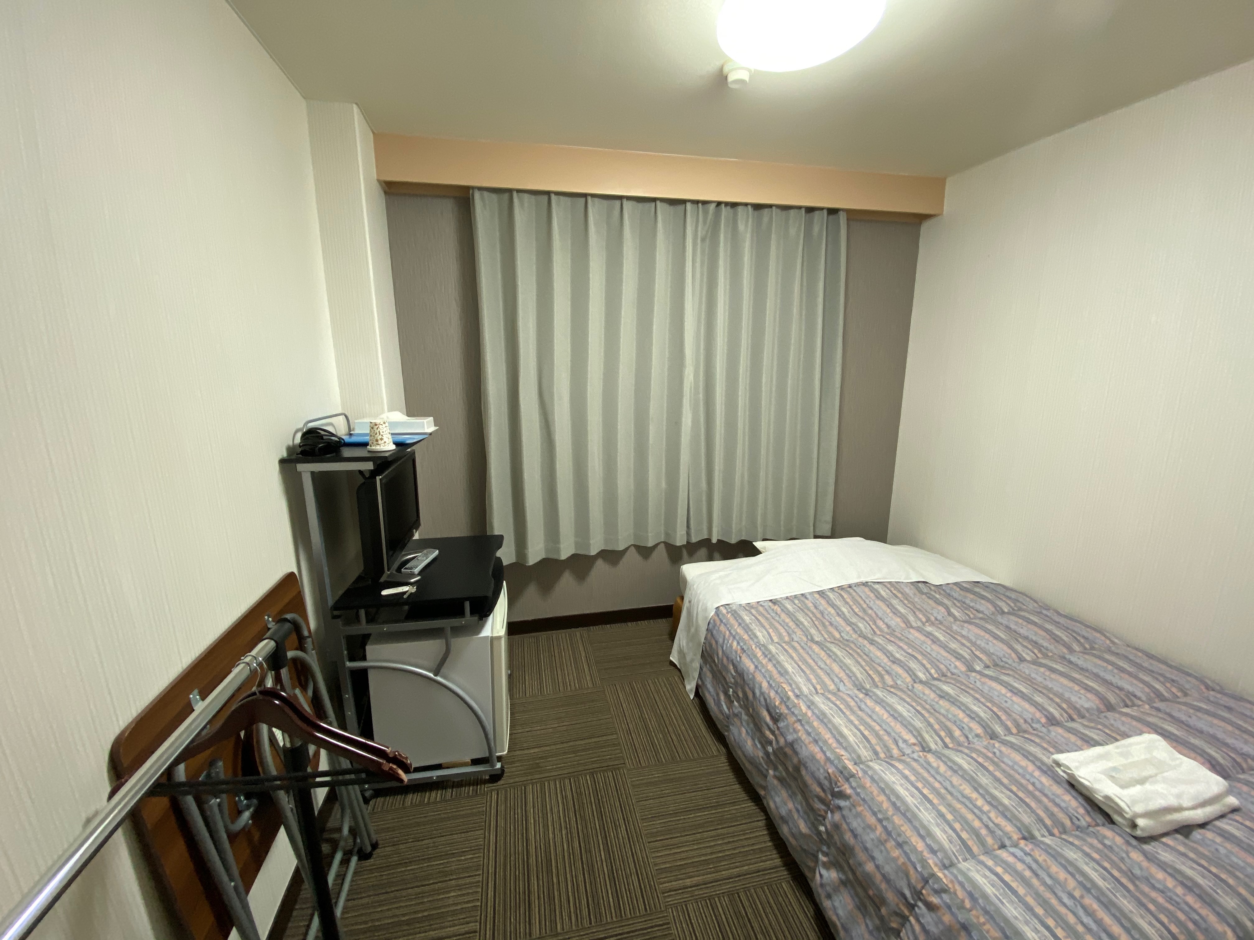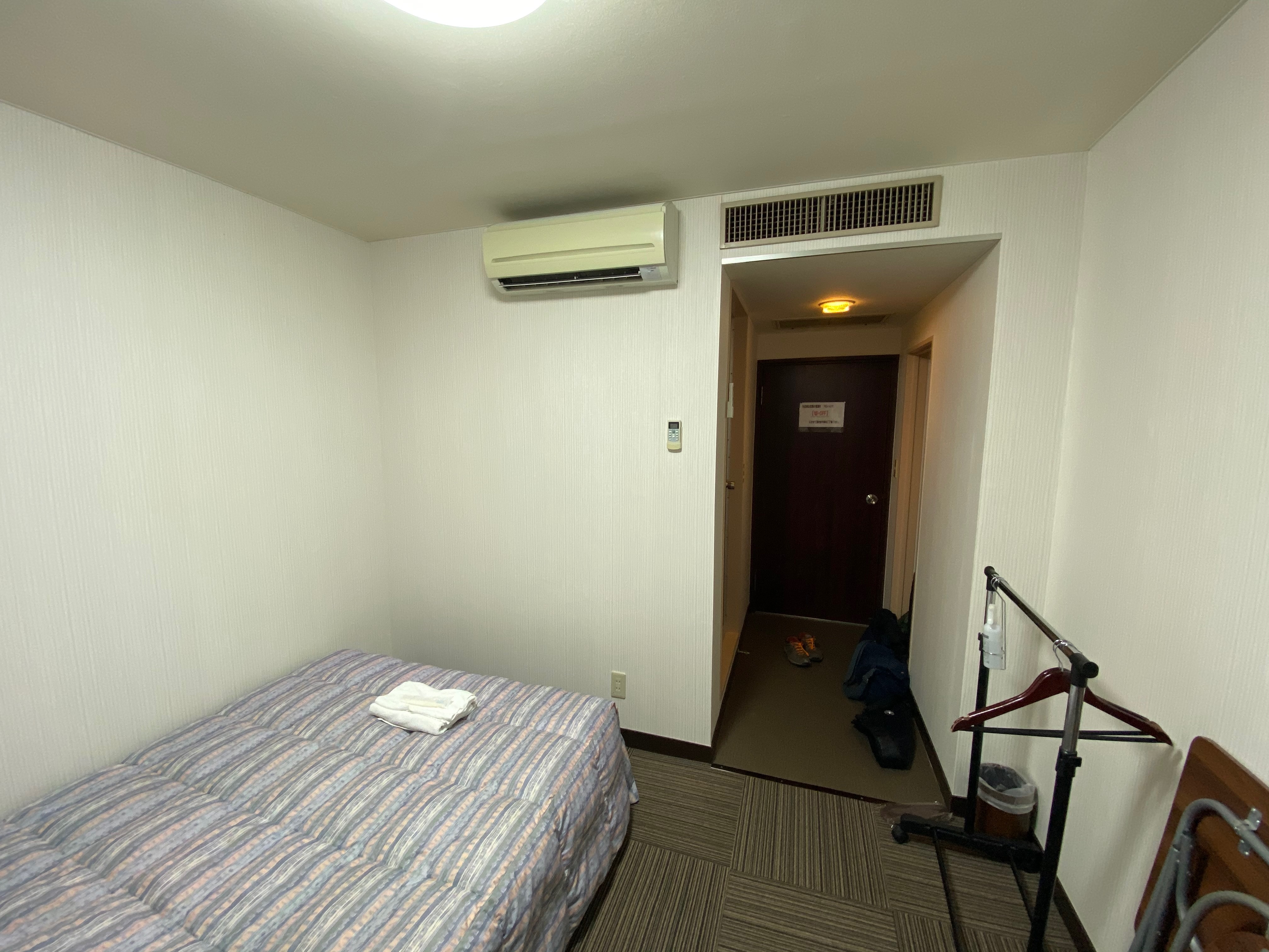 ベッドの向きを逆にすれば、コンセントもあるしエアコンの風も直撃じゃなくなるので、なぜこっち向きに置いたのか疑問。まあテレビの配線の関係なんだろう。